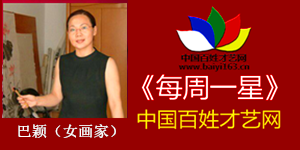 百姓才藝網(wǎng)第十五周介紹的《百姓明星》是女畫家巴穎。巴穎,女,1963年出生,滿族,號(hào)逸蘭軒主人,生于遼寧鞍山,曾畢業(yè)于魯迅美術(shù)學(xué)院,后進(jìn)修于清華大學(xué)美術(shù)理論與書畫創(chuàng)作高研班。