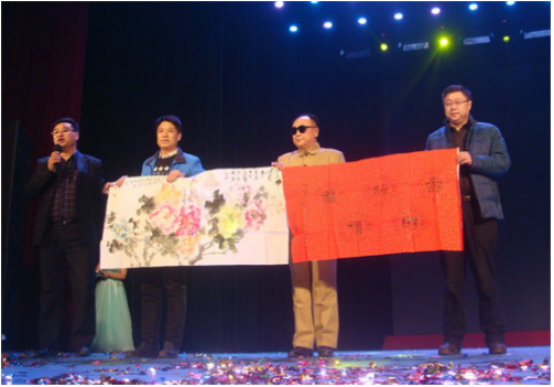 百姓才藝網(wǎng)總編輯邵華(左1)、副總編鄭志庫(左2)、愛心書畫家劉明輝(右1)