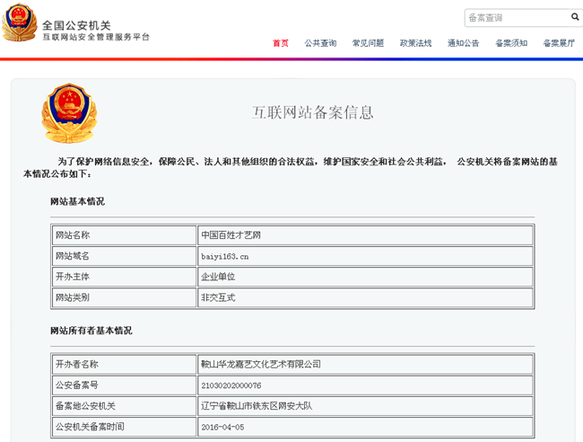 百姓才藝網(wǎng)在全國公安機(jī)關(guān)互聯(lián)網(wǎng)備案