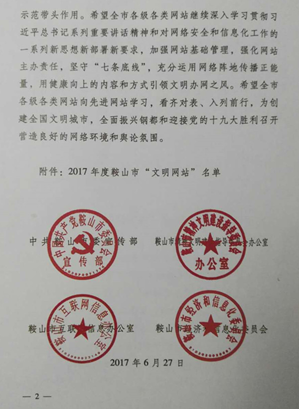 根據(jù)《關(guān)于開展“文明網(wǎng)站”評選活動的通知》(鞍宣發(fā)〔2017〕22號)文件精神,市委宣傳部、市網(wǎng)信辦、市文明辦和市經(jīng)信委聯(lián)合開展了文明網(wǎng)站評選活動。經(jīng)推薦、初選、評審等環(huán)節(jié),決定授予中國鞍山等14家網(wǎng)站為2017年度鞍山市“文明網(wǎng)站”稱號,并予以通報表彰。