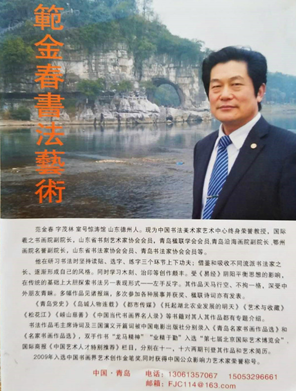 范金春字茂林室號驚濤館山東德州人。現(xiàn)為中國書法美術(shù)家藝術(shù)中心終身榮譽教授,國際羲之書畫院副院長,山東省書刻藝術(shù)家協(xié)會會員,青島市楹聯(lián)學會會員,青島沿海畫院副院長,鄂州畫院名譽副院長,他在研習書法時堅持讀貼、選字、練字三個環(huán)節(jié)上下功夫;借鑒和吸收不同流派書法之長、逐漸形成自己的風格。同時學習木刻、治印等創(chuàng)作收獲頗豐。受《易經(jīng)》陰陽平衡思想的影響,在傳統(tǒng)的基礎(chǔ)上大膽探索書法另一表現(xiàn)形式——左手反字。其作品天馬行空、不拘一格,深受中外朋友青睞。多幅作品見諸報端,多次參加各種展事并獲獎、楹聯(lián)詩詞亦有發(fā)表。《青島黨史》《島城人物連載》《都市傳媒》《托起湖北農(nóng)業(yè)發(fā)展的明天》《藝術(shù)與收藏》《松花江》《嶗山慈善》《中國當代書畫界名人錄》等書籍對其人其作品都有專題介紹。書法作品毛主席詩詞及三國演義開篇詞被中國電影出版社分別錄入《青島名家書畫作品選》和《名家書畫作品選》,雙手作書“龍馬精神”“業(yè)精于勤”入選“第七屆北京國際藝術(shù)博覽會”,國際商報《中國藝術(shù)人才特別推薦》欄目,分別在十一,十六兩期刊登其作品和藝術(shù)簡歷。2009年入選中國書畫界藝術(shù)創(chuàng)作金筆獎.同時獲得中國公眾影響力藝術(shù)家榮譽稱號。