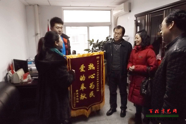 孫玉琴母女真誠的向邢天偉書記遞上代表自己心情的錦旗