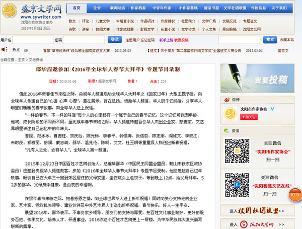 2015年12月23日百姓才藝網創始人、總編輯邵華(中國民主同盟會盟員、鞍山市鐵東區八屆政協委員)應邀到央視華人頻道做客,參加《2016年全球華人春節大拜年》專題節目錄制。他回想起自己過年軼事,暢談自已在大年三十回到郊區居住的父母家里,坐在炕頭上包餃子,等到晚上12點,給父母拜年,52歲的邵華,父母身體健康,是由衷的幸福啊。