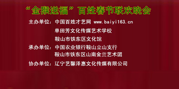 百姓才藝網(wǎng)秉承“服務(wù)百姓、傳承文化、培養(yǎng)人才、開拓事業(yè)”的理念,在春節(jié)來臨之際與單田芳文化傳媒藝術(shù)學(xué)校、鞍山市鐵東區(qū)文化館聯(lián)合舉辦2016“金猴送福”百姓春節(jié)聯(lián)歡晚會,樹立文化藝術(shù)品牌形象,挖掘才俊、培養(yǎng)人才,服務(wù)社會。