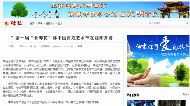 為慶祝七一中國共產黨成立95周年,共同回顧我們黨走過的95周年光輝歷程。2016年6月16日上午,由百姓才藝網、遼寧省合唱協會、中國夢藝術協會主辦,長壽花食品股份有限公司、沈陽欣拓宏商貿有限公司、遼寧省工商聯文化藝術產業聯盟、沈陽世茂新發展置業有限公司、沈陽市南二地區商貿行業聯合黨委(工會)協辦的《2016“高歌頌黨”第一屆“長壽花”杯中國百姓藝術節活動》開幕式,在沈陽九龍港廣場隆重舉行。