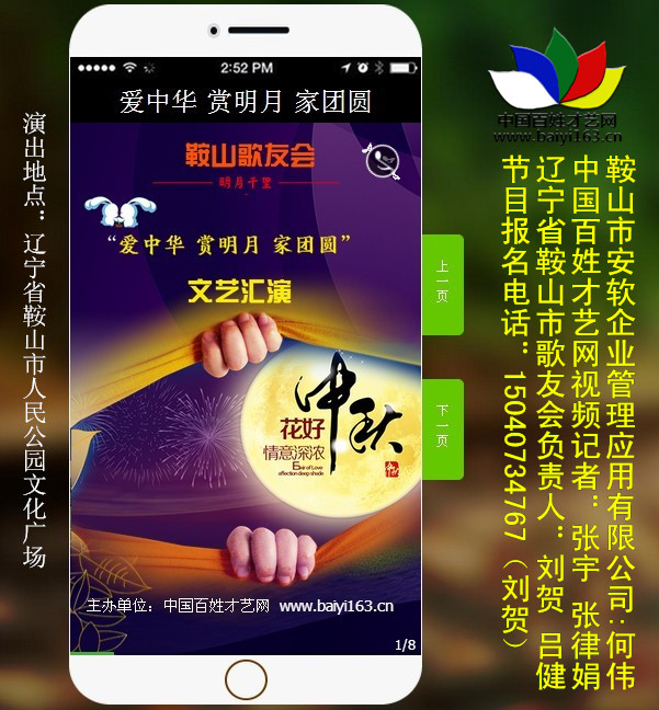 這次活動的承辦單位是遼寧省鞍山市歌友會,協辦單位是鞍山市安軟企業管理應用有限公司。本次中秋公益演出節目有歌舞、口技、書法展示、器樂、曲藝、少兒才藝表演等。百姓大舞臺、有才你就來。