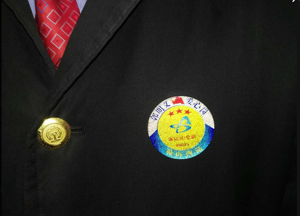 在史新胸前看到了佩戴的“郭明義愛(ài)心崗”胸牌