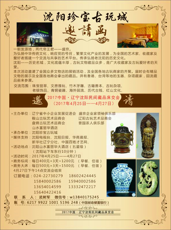 2017沈陽(yáng)珍寶古玩城開(kāi)業(yè)典禮暨首屆沈陽(yáng)珍寶古玩城——古玩文化藝術(shù)品博覽會(huì)誠(chéng)邀您光臨,時(shí)間為2017年4月28日——5月12日。此次活動(dòng)是為了弘揚(yáng)傳承民族傳統(tǒng)文化,聚八方文萃推中華古韻---盛京沈陽(yáng),在沈陽(yáng)的黃金地段,老北市場(chǎng)--皇寺廟會(huì)舉辦。為了繁榮文化產(chǎn)業(yè)的發(fā)展,為全國(guó)的藝術(shù)家,收藏家及愛(ài)好者搭建一個(gè)交流與共享的藝術(shù)平臺(tái),傳承弘揚(yáng)老沈陽(yáng)的歷史文化。活動(dòng)中邀請(qǐng)了全國(guó)眾多文物店,屆時(shí)會(huì)有精品的文物展示及全國(guó)各地商會(huì)拿出的藏品,并有香港。臺(tái)灣等地的玉器。雜項(xiàng)藏家,回流藏品前來(lái)參展。