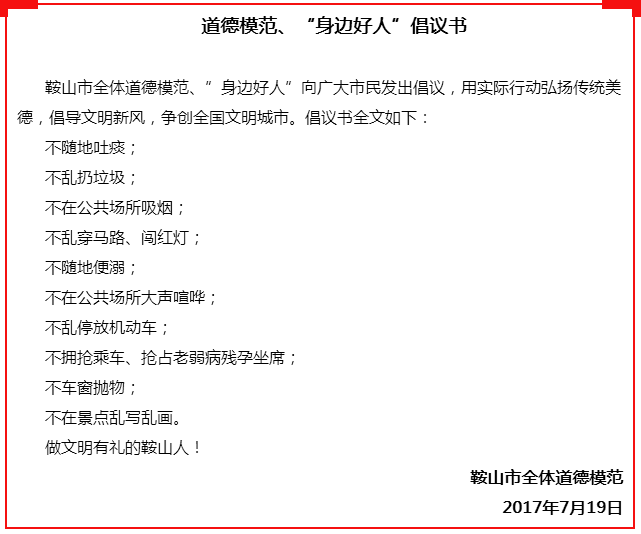 百姓才藝網(wǎng)鞍山訊(王詩陽 文/攝影)鞍山市全體道德模范、”身邊好人”向廣大市民發(fā)出倡議,用實際行動弘揚傳統(tǒng)美德,倡導文明新風,爭創(chuàng)全國文明城市。