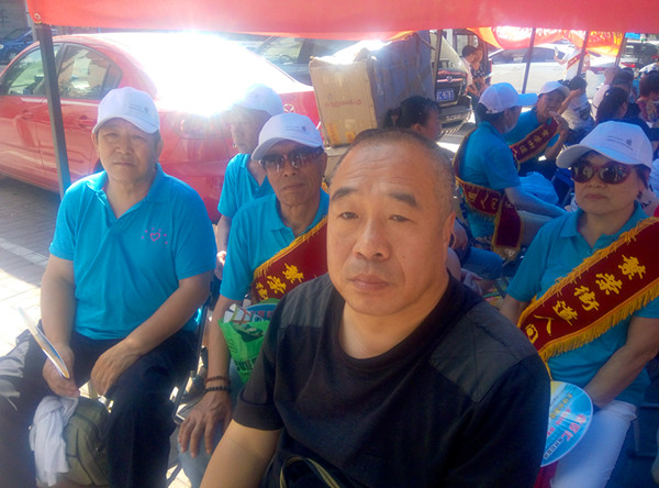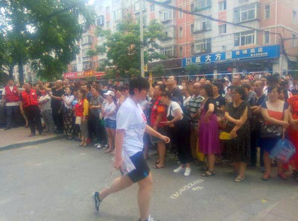 虹橋社區(qū)黨委第一書記、中國好人、郭明義愛心團隊總指揮孫寶江帶領愛心團隊為育才中考考場學生家長獻愛心。(右一)