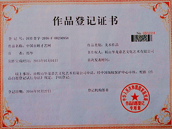 百姓才藝網(wǎng)標(biāo)識獲得中華人民共和國國家版權(quán)局頒發(fā)的版權(quán)榮譽證書。證書登記號為:國作登字—2016—F—00250958,作者:邵華,創(chuàng)作完成時間:2013年01月01日,著作權(quán)人:鞍山華龍嘉藝文化藝術(shù)有限公司。
