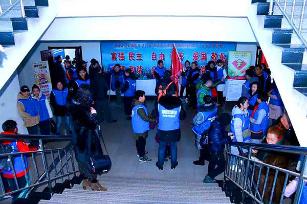 志愿者們聽取當代雷鋒郭明義幫助困難學生渡難關上大學的感人故事