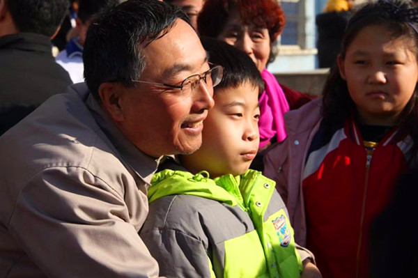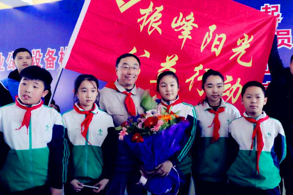 郭明義為學生們做愛國主義教育報告、愛黨愛社會。好好學習、回報國家。