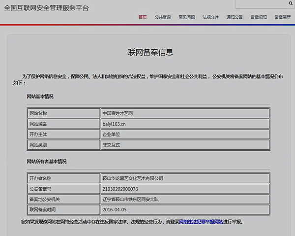 百姓才藝網(wǎng)訊(百藝/文)為了保護(hù)網(wǎng)絡(luò)信息安全,保障公民、法人和其他組織的合法權(quán)益,維護(hù)國家安全和社會公共利益,公安機(jī)關(guān)將備案網(wǎng)站的基本情況公布如下: