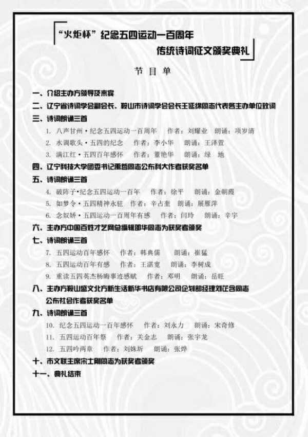 為了紀念五四運動一百周年,鞍山市詩詞學會、遼寧科技大學團委、百姓才藝網、鞍山盛文北方新生活新華書店有限公司,聯合舉辦了“火炬杯”紀念五四運動一百周年傳統詩詞征文活動。詩詞是我國傳統文化的瑰寶。采用詩詞創作與征集的方式紀念五四運動,有其重要意義。五四運動是一場傳播新思想、新文化、新知識的偉大思想啟蒙運動和新文化運動。我們用詩詞這種傳統的文化形式,謳歌愛國、進步、民主、科學,這既是對五四運動思想、文化、精神的傳承,也體現了我們的文化自信。經過百年實踐與思考,我們黨,我們國家,我們全社會,對中國傳統文化的理解、判斷和感悟,更加客觀,更加深刻,對優秀傳統文化強大的生命力與深遠的教化作用,給予了充分的肯定。習近平總書記在這方面有很多重要、經典的論述,為我們認識傳統文化,增強文化自信,提供了思想理論上的指引。中央電視臺的詩詞大會和經典詠流傳等節目,都充分的體現了這一認知。我們這次通過詩詞創作與征集紀念五四運動,也是以這一認知為前提。