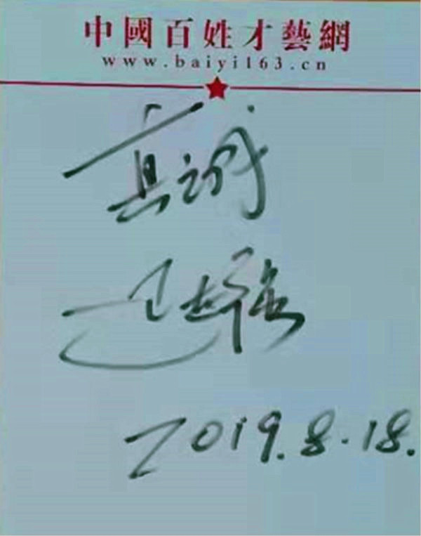 百姓才藝網(wǎng)遼陽站訊(李聞盛/錄制)2019年8月18日,影星、歌星遲志強為百姓才藝網(wǎng)題字“真誠”,希望百姓才藝網(wǎng)真誠為百姓才俊服務(wù),成為老百姓最喜歡的文化藝術(shù)網(wǎng)站,更好的服務(wù)社會,永遠(yuǎn)跟黨走、傳遞正能量。同時,也希望創(chuàng)始人邵華總編事業(yè)有成、實現(xiàn)自己的夢想,好人一生平安,為中國百姓文化事業(yè)貢獻(xiàn)力量。