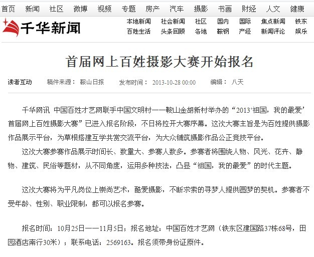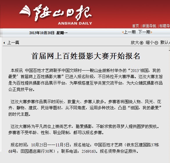 11、凡熱情支持本屆攝影大賽的企事業單位,百姓才藝網將投桃報李,指派記者撰寫千字文章并配照片在網上發表,傾力推介宣傳。有意合作、聯辦、協辦、冠名的企事業單位或商業、餐飲業和其他行業的朋友可電話聯系或面議。