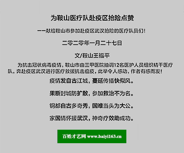百姓才藝網快訊(百藝/文)疫情當前,百姓才藝網積極宣傳預防新型冠狀疫情工作。作為新媒體單位,雖然不能象醫護人員、武警官兵那樣沖到前線,但我們可以號召作家、書法家,把手中筆作為武器,向疫情宣戰,采取多形式多途徑進行疫情防控宣傳,有效提高了老百姓的自保、防控意識。
