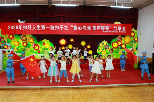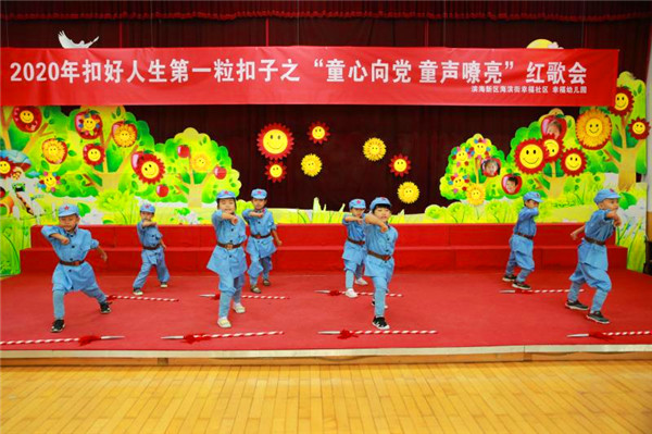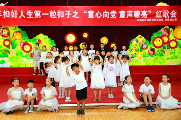 稚嫩而又嘹亮的童聲劃破盛夏的天空,飛出了天津市濱海新區(qū)海濱街幸福幼兒園的窗戶,回蕩在幸福社區(qū)上空,一場慶祝八一建軍節(jié)“童心向黨童聲嘹亮”的紅歌比賽正在進行中。