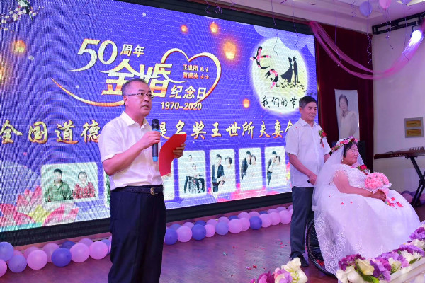 今天金婚的主角是提名第七屆全國道德模范(提名獎)的王世所。王世所是一名退休的普通工人,他的愛妻故事堪稱“愛情神話”。結(jié)婚剛一年,妻子癱瘓,他把痛苦深埋心底,每天徒步3小時推三輪車為妻子求醫(yī)。清晨4時起床給妻子洗尿布,在單位食堂吃咸菜省5片五花肉也要留給妻子,放棄單位外出進修機會,下崗后甘愿做更夫……妻子癱瘓了50年,他默默相守了50年,用真愛為妻子撐起了一片晴空,驗證了一個丈夫?qū)ζ拮右簧某兄Z:“你若不離不棄,我必生死相依。”