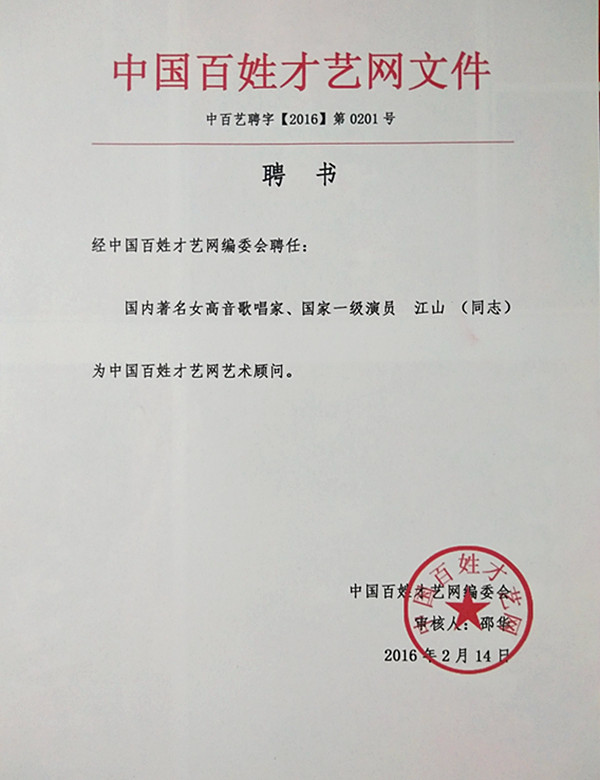 2016年2月,百姓才藝網(wǎng)聘請國家一級演員江山為藝術顧問。