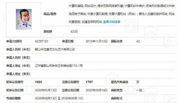 百姓才藝網(wǎng)創(chuàng)始人、總編輯邵華漫畫像自2019年11月13日向國家商標局遞交申請,經(jīng)過9個月審核受理,于2020年8月14日申請商標正式獲批,國際分類42類,期限為2020年8月14日至2030年8月13日。
