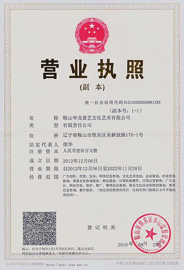 鞍山華龍嘉藝文化藝術有限公司是遼寧省鞍山市工商局審核,2012年12月注冊備案通過的一家文化藝術有限公司,注冊資金:100萬。
