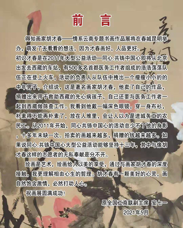 胡才春老師用畫作描繪出來這里的美麗風(fēng)景。此次云南專題 《才春才情文化文旅之情系云南專題書畫展》展現(xiàn)真正的國畫巔峰。參展藝術(shù)家有胡才春、蔣金玲、陳宬。此次畫展精選作品40余幅,歡迎參觀學(xué)習(xí)和學(xué)術(shù)交流。
