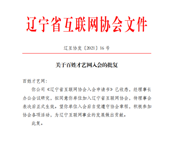 百姓才藝網(wǎng)快訊(姜海芳/文)2021年6月18日,百姓才藝網(wǎng)正式加入“遼寧省互聯(lián)網(wǎng)協(xié)會”,成為會員單位。按照“遼寧省互聯(lián)網(wǎng)協(xié)會”批復(fù)中要求:我單位入會后自覺遵守協(xié)會章程,積極參加協(xié)會各項活動,為遼寧互聯(lián)網(wǎng)事業(yè)的發(fā)展做出貢獻。