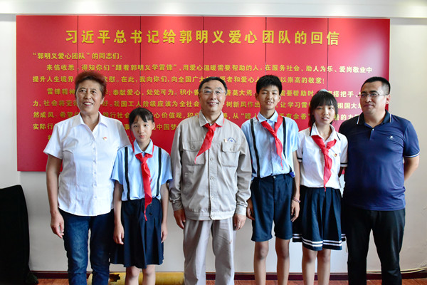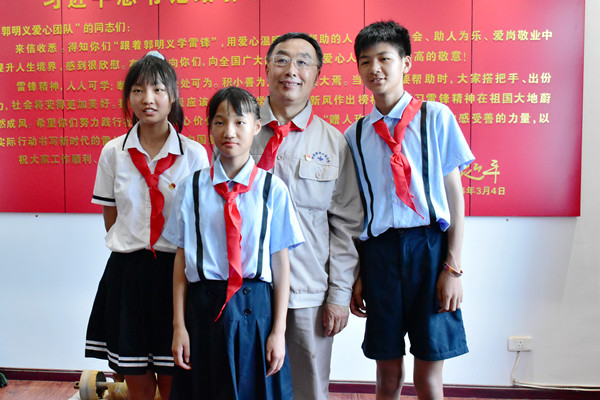 活動中,郭明義親切詢問孩子們在校學習和生活情況,關心孩子們畢業(yè)后的工作,為她們的未來把脈定向,鼓勵孩子們努力學習,畢業(yè)后回報社會,為國家建設貢獻力量。三姐弟被郭爺爺無微不至的關懷深深感動,她們給郭爺爺戴上了鮮艷的紅領巾,向和藹可親的郭爺爺敬禮!