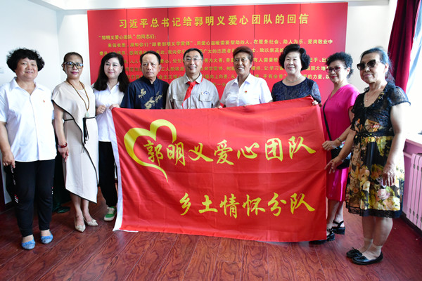 當代雷鋒郭明義為“鄉(xiāng)土情懷”愛心團隊授旗_百姓才藝網(wǎng)