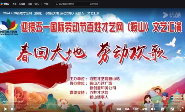 在這美好的季節(jié),五一國際勞動節(jié)即將來臨之際,2024年4月28日下午3時,一場由百姓才藝網(wǎng)鞍山站主辦,鞍山萬達(dá)廣場、新創(chuàng)意印務(wù)公司協(xié)辦,百姓才藝網(wǎng)、鞍山話事人等媒體支持的《春回大地,勞動歡歌》文藝匯演在遼寧鞍山萬達(dá)廣場拉開了帷幕。