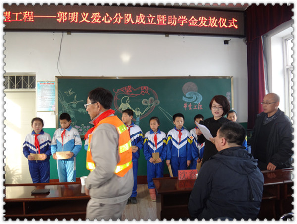2013年12月10日,郭明義愛(ài)心團(tuán)隊(duì)——鞍山市聚星法律服務(wù)所分隊(duì)來(lái)到了鞍山市齊大山礦第二小學(xué),舉行捐助儀式。為那里的孩子送去本年度的助學(xué)金,向孩子們獻(xiàn)出愛(ài)心。 中共 中央 候補(bǔ) 委員、全國(guó) 總工會(huì) 副主席、中共十八大代表、 全國(guó)道德模范 郭明義也參加了捐助儀式。分隊(duì)成員現(xiàn)場(chǎng)將助學(xué)金交到了孩子們的手中,孩子們發(fā)自?xún)?nèi)心地向好心的叔叔、阿姨表示感謝。