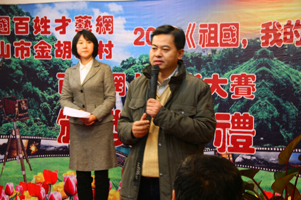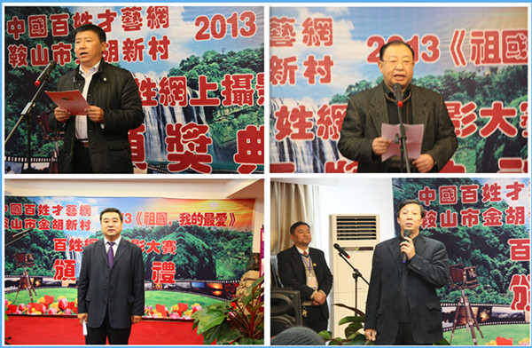 百姓才藝網(wǎng)總編徐少多在頒獎典禮上發(fā)表講話。他首先感謝合作伙伴金胡新村,這個擁有七項國家級榮譽的中國文明村對中國百姓才藝網(wǎng)的發(fā)展和建設及這次大賽給予了極大的幫助和支持,在人力、物力、財力等方面的鼎力相助,慷慨以饋。對鞍山工人報、千山秀色影友沙龍、劉志斌攝影學校的大力協(xié)作和熱情參與表示感謝。同時他向這次大賽擔任評委的鞍山攝影家協(xié)會主席楊東輝、副主席高玉峰和王雁祥三位先生的專業(yè)精神、嚴謹作風和純凈品性表示欽佩和敬意。