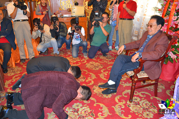 百姓才藝網(wǎng)鞍山站訊(楊廣軍 文/攝影)2014年國慶節(jié)前夕,國內(nèi)著名評書表演藝術(shù)家單田芳回家鄉(xiāng)鞍山市收兩位弟子。第38位弟子是徐文祥、39位弟子是楊東玉。