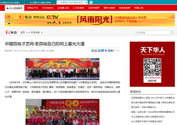 2009年7月,遼寧鞍山人邵華與幾位文化傳媒界同仁共同籌劃并創(chuàng)建了《百姓才藝網(wǎng)》,旨在為中國(guó)新媒體和文化事業(yè)發(fā)展貢獻(xiàn)才智。《百姓才藝網(wǎng)》秉承“承諾是銀、踐諾是金”的理念,堅(jiān)持“服務(wù)百姓、傳播文化、培養(yǎng)人才、拓展市場(chǎng)”的宗旨,面向基層、面向群眾,為廣大百姓提供展示才藝的網(wǎng)絡(luò)平臺(tái),努力打造老百姓自己的網(wǎng)上星光大道。