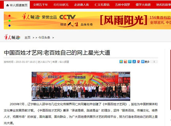 最近,百姓才藝網(wǎng)走進(jìn)了央視《華人頻道》,并在今日頭條進(jìn)行了報(bào)道。這是中國百姓才藝網(wǎng)的光榮,也是鞍山市的光榮。