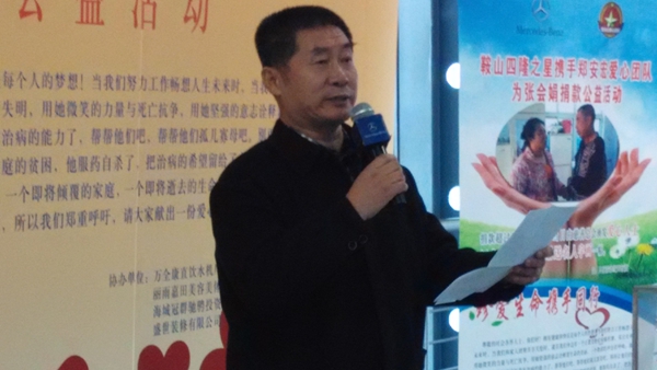 下午1點20分,活動儀式正式開始。鞍山市慈善總會秘書長韓岐山首先講話。他高度贊揚了鄭安宏愛心團隊一直以來無私無畏的奉獻精神,并對近一個月以來鄭安宏團隊捐資助學(xué)和對晚期癌癥病患張會娟的善舉作了充分的肯定。是鄭安宏愛心團隊的大愛在社會上產(chǎn)生了轟動效應(yīng):像鞍山置業(yè)擔(dān)保股份有限公司董事長肖廣懷、鞍山奇典生態(tài)科技公司董事長葛輝、瑞天醫(yī)院院長張曉研等愛心企業(yè)界人士也紛紛投入到慈善事業(yè)中來,使那些貧困學(xué)生不再為學(xué)費擔(dān)憂,張會娟不再為治療的費用發(fā)愁。鄭安宏愛心團隊的企業(yè)界人士肖廣懷也在捐贈儀式上發(fā)了言。他總結(jié)了鄭安宏二十幾年來堅定不移做慈善公益事業(yè),散盡家財為公益,無怨無悔獻大愛的風(fēng)雨歷程。并表示:要把利在當(dāng)代,功在千秋的慈善公益大旗高高舉起,伸出溫暖的雙手,給那些需要幫助的貧困家庭以生的希望,讓那些無助的孩子實現(xiàn)求學(xué)夢。鄭安宏在捐贈儀式上,對二十幾年來,市慈善總會等各級領(lǐng)導(dǎo)和社會各界人士對愛心團隊的支持表示深深地感謝,并立下“生命不息,愛心不止”豪言,令在場的人無不為之感動。
