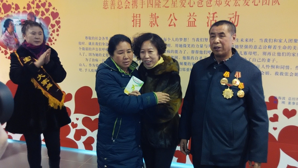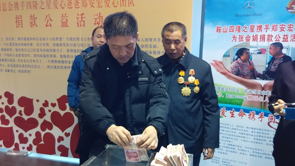 當(dāng)主持人宣布愛心捐款開始后,鄭安宏愛心團隊的朋友們紛紛走向捐款箱,讓人沒有想到的是,企業(yè)界愛心人士、鞍山置業(yè)股份有限公司董事長肖廣懷,在九天前剛剛捐了五萬元,在這現(xiàn)場愛心捐贈儀式上又捐出一千元,令在場的全體朋友深受感動。愛心爸爸鄭安宏,把上一次捐款,即九天前現(xiàn)場收到的愛心捐款中拿出五萬一千元再加上這次現(xiàn)場捐助的,湊足六萬,全部贈予張會娟。瑞天醫(yī)院院方代表也在現(xiàn)場表示:為張會娟免費透析,并提供車接車送服務(wù)。