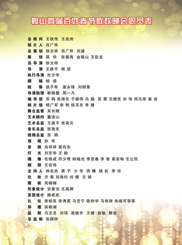 晚會編導(dǎo)組主要成員均為2014年鞍山電視臺春節(jié)聯(lián)歡晚會導(dǎo)演組原班人馬。現(xiàn)場燈光、舞美、音響、LED均為鞍山一流。