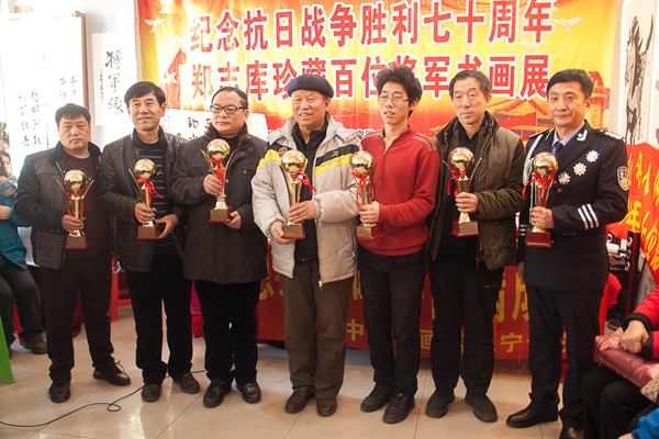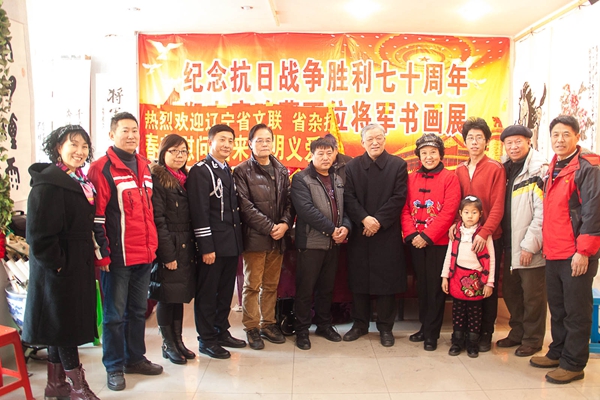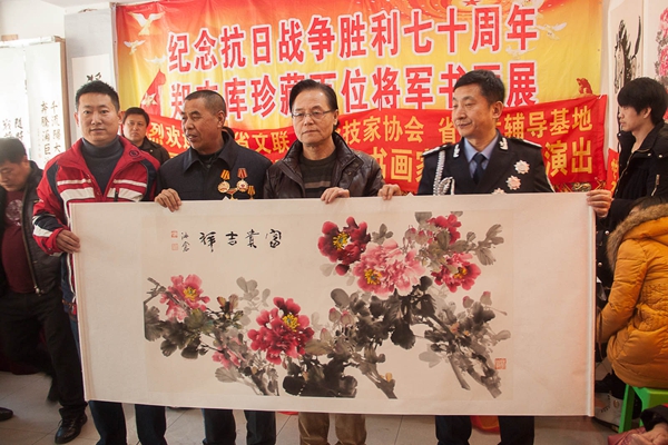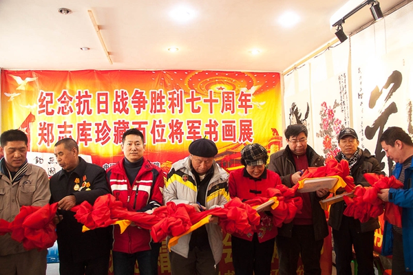 百姓才藝網(wǎng)訊(李光 文/攝影)為紀(jì)念抗日戰(zhàn)爭(zhēng)勝利70周年,由中國(guó)和合書(shū)畫(huà)研究院遼寧分院主辦的鄭志庫(kù)同志收藏中國(guó)百名將軍書(shū)畫(huà)展2月11日在鞍山鐵東畫(huà)院舉行,共展出將軍書(shū)畫(huà)作品107幅。幾年來(lái),鄭志庫(kù)先后在全國(guó)百座城市,百座軍營(yíng),百所大學(xué),百個(gè)社區(qū)共舉辦將軍書(shū)畫(huà)巡回展103場(chǎng),做報(bào)告39場(chǎng),觀眾達(dá)到10萬(wàn)余人。