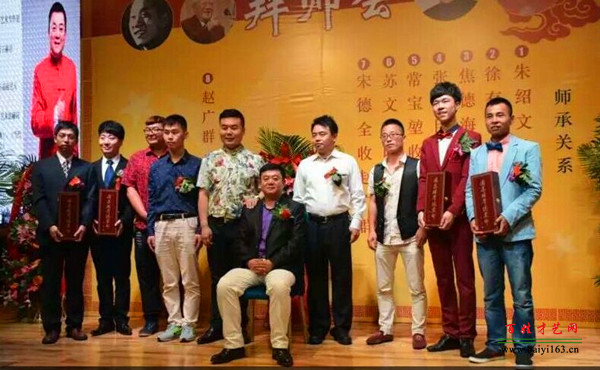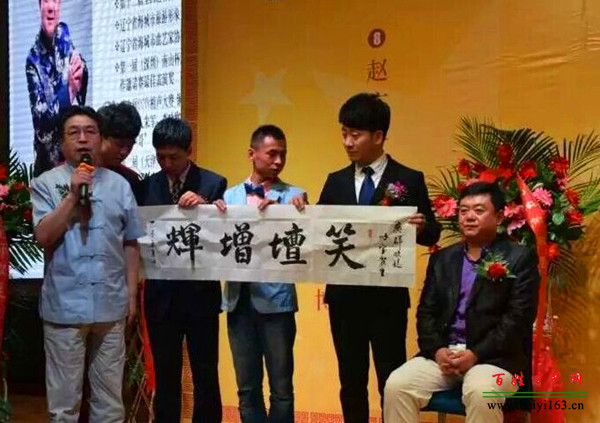 中國文聯(lián)副主席、著名評書表演藝術(shù)家劉蘭芳老師在現(xiàn)場講話中給予了趙廣群先生以厚望,并感慨晚輩趙廣群在短短兩三年內(nèi)做出的喜人成績。被譽為相聲界“京城教師爺”的劉洪沂老師在現(xiàn)場向趙廣群先生贈送了“笑壇增輝”四個大字,并在講話中期望趙廣群先生和徒弟們承傳相聲藝術(shù),為笑壇增輝添彩!截止今天,趙廣群先生已經(jīng)收徒9位新人。儀式上,他希望弟子們將相聲藝術(shù)在傳承中不斷創(chuàng)新,闖出一條屬于自己的藝術(shù)之路。中國隸書長卷第一人王景龍先生在現(xiàn)場揮毫潑墨,代表藝壇兄弟為趙廣群先生寫下了“義薄云天”和“德藝雙馨”兩幅題字。