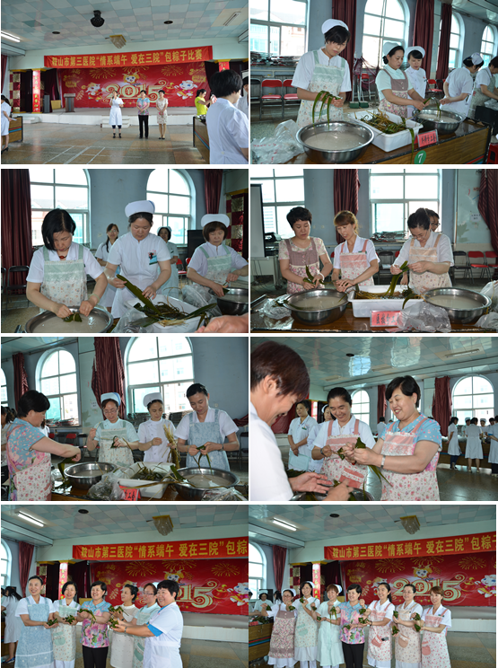 為挖掘傳統節日的文化和精神內涵,弘揚中華民族優秀文化,使職工在感受節日快樂的同時,增加團結互助,積極競爭的意識,鞍山市第三醫院于2015年6月18日下午13:30舉辦“情系端午 愛在三院”包粽子比賽。比賽以分工會為單位,派2名代表組成一組參賽。每組選手在30分鐘內包粽子數量多少,且保證質量、外形美觀作為評判標準,評選出集體優勝。