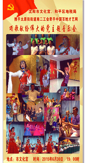 2015年6月30日晚上7時,沈陽市文化館、沈陽和平區(qū)地稅局、太原街街道南二工會、中國百姓才藝網(wǎng)聯(lián)合舉辦了“頌歌獻給偉大的黨”主題音樂會。