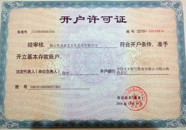 鞍山華龍嘉藝文化藝術(shù)有限公司開戶銀行:中國光大銀行股份有限公司鞍山鐵西支行