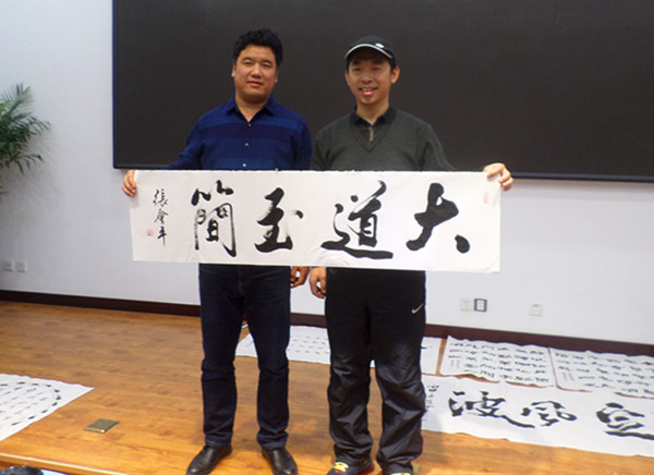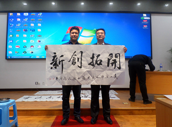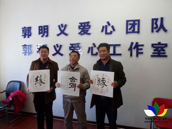 張會平(右一)是中國書法協(xié)會會員、當(dāng)代雷鋒郭明義(中)、青年書法家李偉(左一)