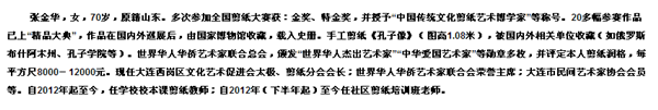 家住大連70多歲的張金華從母親那里繼承了剪紙技藝,多次獲獎(jiǎng)。2012年榮獲了迎新春大連市民剪紙大賽一等獎(jiǎng)。她的晚年生活非常充實(shí),每天忙忙碌碌,快樂(lè)的同時(shí)還不忘帶動(dòng)其他的老年人一起剪紙。她說(shuō),剪紙這門(mén)傳統(tǒng)的技藝面臨著失傳的危機(jī),不用說(shuō)年輕人,就是老年人會(huì)剪紙的也不多了,這么美的藝術(shù),失傳了也真是太可惜了。