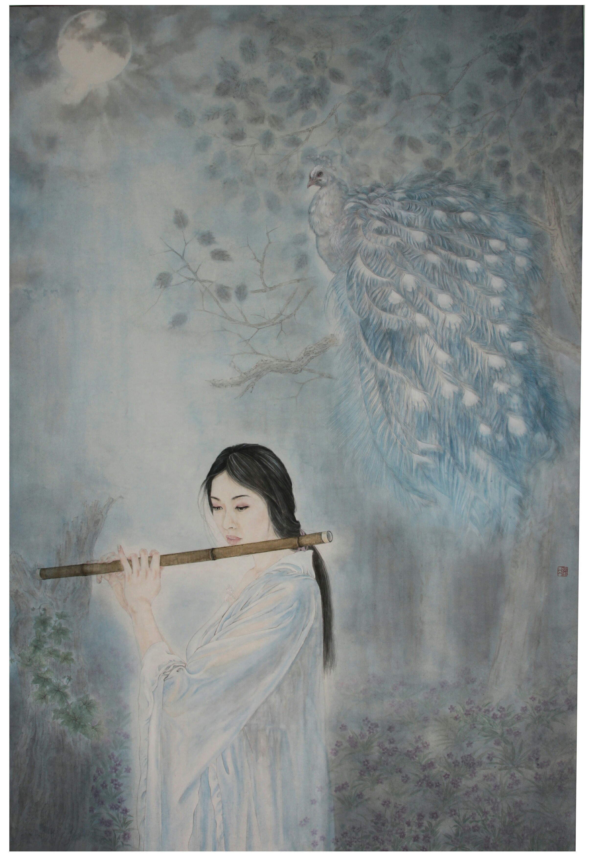 女性畫(huà)家當(dāng)然也有區(qū)別于男性畫(huà)家的特點(diǎn)。她的筆墨沉靜而柔和,也是畫(huà)家在浮躁世風(fēng)下的自處之道。在她的繪畫(huà)中,常常有一種女性特有的嫵媚和溫婉。在她的作品《蘭月光》中,這件作品還是給人以相當(dāng)靜謐和幽雅的感覺(jué)。無(wú)論是月色還是女子,都帶有女性獨(dú)有的氣息,月色如夢(mèng)似幻一般的傾灑以及背景處虛化,在畫(huà)中能尋找與心靈情感相對(duì)應(yīng)的感覺(jué)。你會(huì)在不知不覺(jué)感到畫(huà)中的意境而產(chǎn)生情感共鳴。