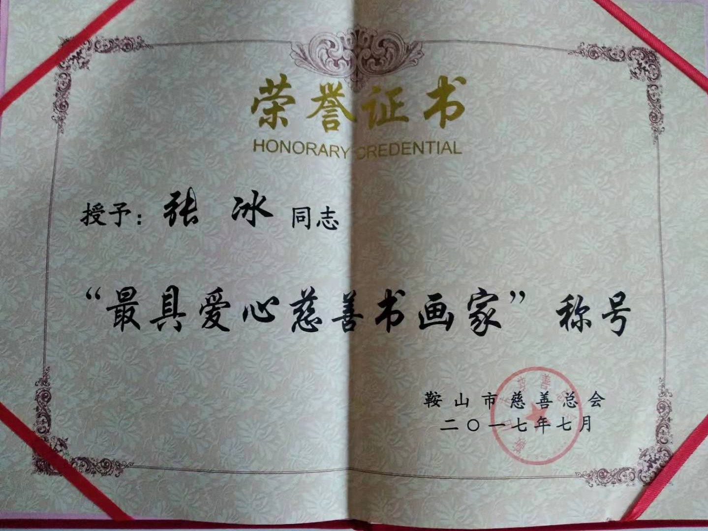 2017年鞍山慈善總會(huì)譽(yù)為“最具愛(ài)心慈善書(shū)畫(huà)家”稱號(hào)。