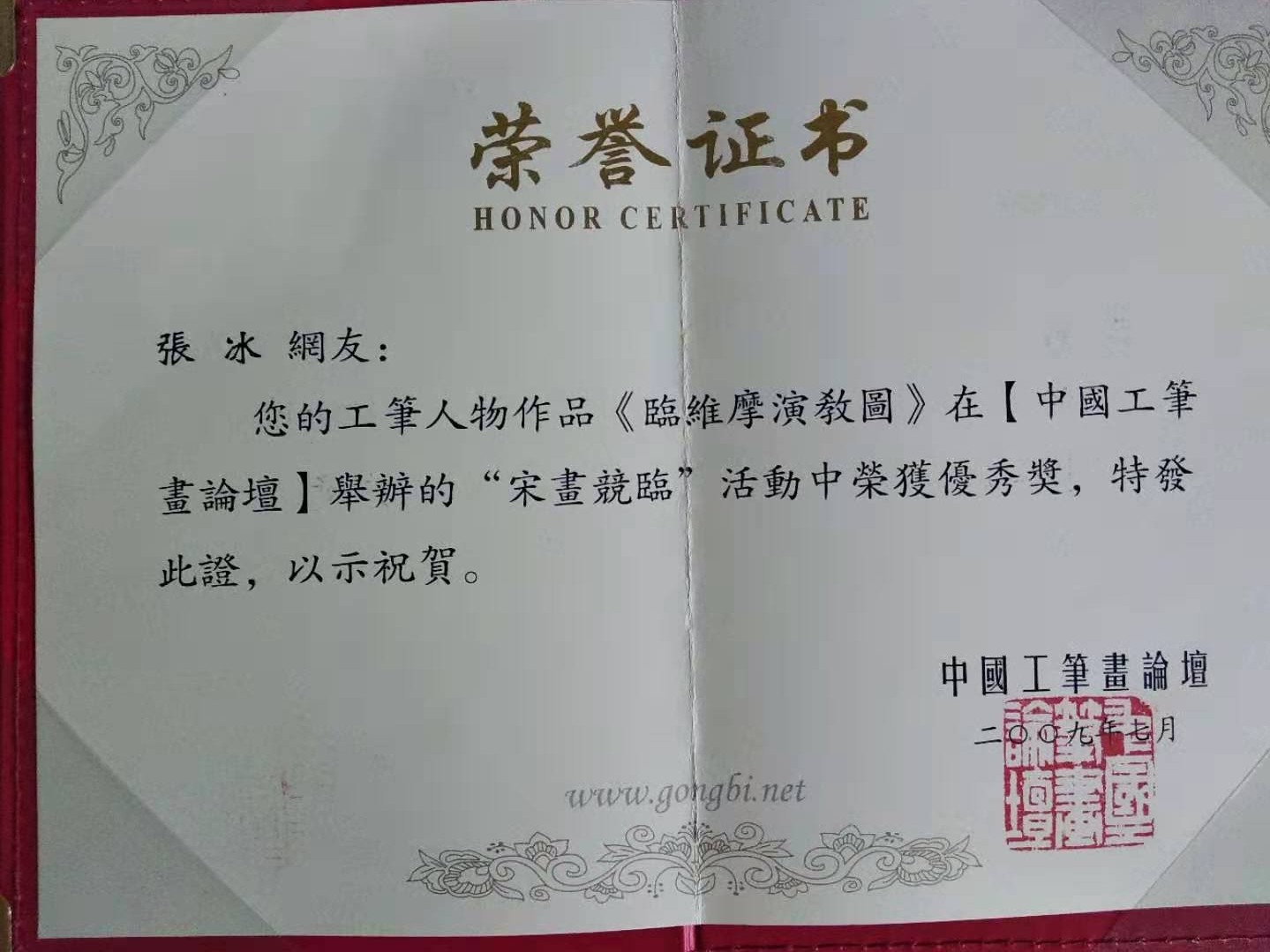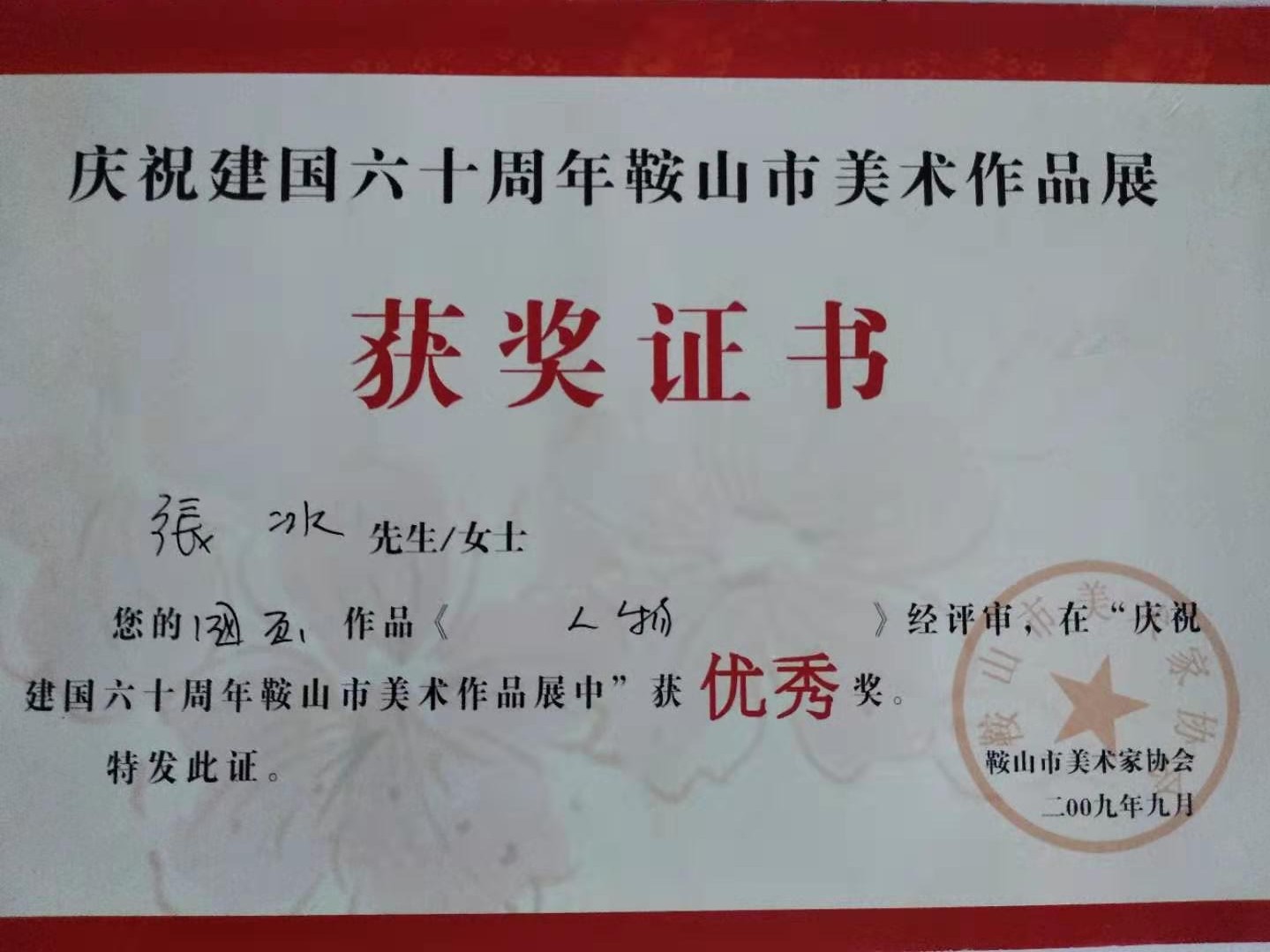 2009年慶祝建國(guó)60周年鞍山美術(shù)作品榮獲優(yōu)秀獎(jiǎng),